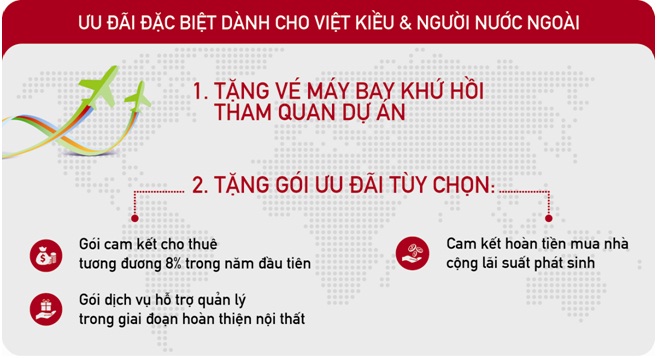 Nhóm khách hàng là Việt kiều và người nước ngoài còn có thêm chương trình bán hàng ưu đãi dành riêng, như tặng vé máy bay để tham quan dự án, tặng gói cam kết cho thuê 8%/năm và gói dịch vụ quản lý trong giai đoạn hoàn thiện nội thất, hoặc cam kết hoàn tiền mua nhà cộng lãi suất phát sinh…
