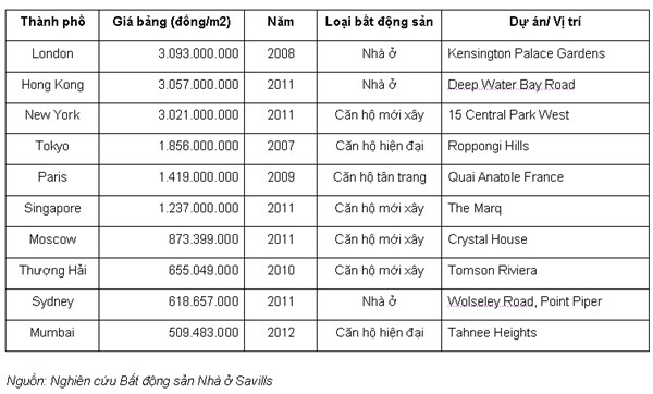 Theo bảng xếp hạng, bất động sản được giao dịch vào năm 2008 tại Kensington Palace Gardens, London đứng đầu danh sách với mức giá là 8.500 bảng Anh/foot vuông (tương đương 3,093 tỷ đồng/m2). Đứng vị trí thứ hai dự án là Deep Water Bay Road tại Hồng Kông với mức giá 8.400 bảng Anh/foot vuông (tương đương 3,057 tỷ đồng/m2), được bán ra vào năm 2011.