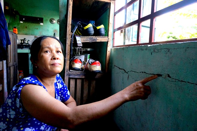 Ngôi nhà mái bằng kiên cố của bà Hồ Thị Hằng (thôn Phú Cường) nằm mép QL1A, tường nứt lỗ chỗ, có những điểm nứt lớn dài cả sải tay. “Họ lu ngoài đường, ly chén trên bàn nhảy bần bật, nhà cửa xuất hiện nhiều vết nứt, nẻ trên tường. Gửi đơn ra xã, ra huyện, đợt rồi có mấy ông bên chỗ chủ đầu tư, bảo hiểm về đây đo, chụp ảnh làm biên bản. Vừa rồi coi danh sách đền bù là... 0 đồng. Tui không biết vì răng lại có chuyện đền bù lạ đời như rứa. Mấy ông trên xã cũng không trả lời được. Họ bảo tiếp tục làm đơn gửi ra huyện”, bà Hằng bức xúc.