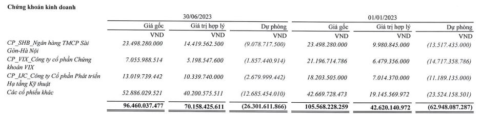 Các khoản đầu tư đáng chú ý trong danh mục của doanh nghiệp này gồm cổ phiếu SHB (23,5 tỷ đồng), trích lập dự phòng 9 tỷ đồng; cổ phiếu IJC (13 tỷ đồng), trích lập dự phòng 2,7 tỷ đồng; cổ phiếu VIX (7 tỷ đồng), trích lập dự phòng 5,2 tỷ đồng và các cổ phiếu khác (52,8 tỷ đồng), trích lập dự phòng 12,6 tỷ đồng.