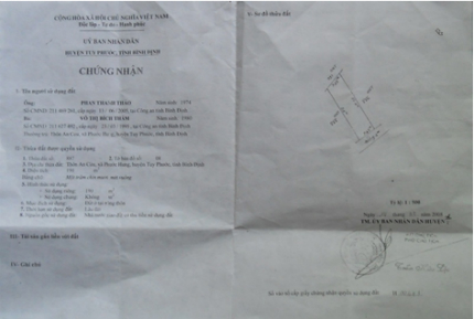 Khoảng đầu năm 2008, vợ chồng ông Phan Thanh Thảo, bà Võ Thị Bích Thắm mua lại của ông Phan Thanh Hiếu (trú cùng địa phương) lô đất tọa lạc tại thôn An Cửu, thuộc thửa đất số 887, tờ bản đồ số 8, diện tích 190m2. Đến tháng 3/2008, lô đất của vợ chồng ông Thảo được UBND huyện Tuy Phước cấp GCNQSDĐ số H00443, có diện tích sử dụng 190m2.