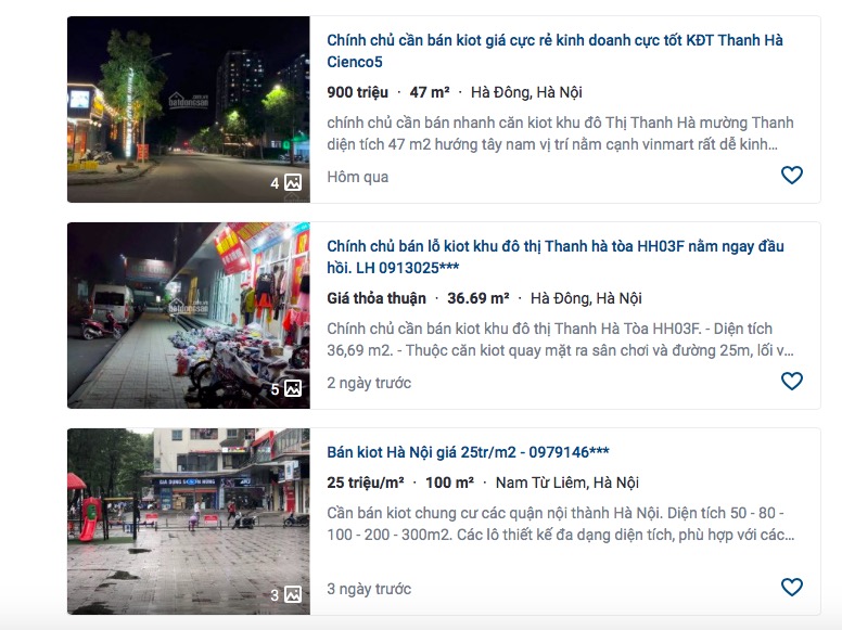 Khảo sát trên một số trang rao vặt cho thấy những căn kiot được rao bán chủ yếu tập trung ở khu vực Hà Đông, Cầu Giấy, Thanh Xuân.