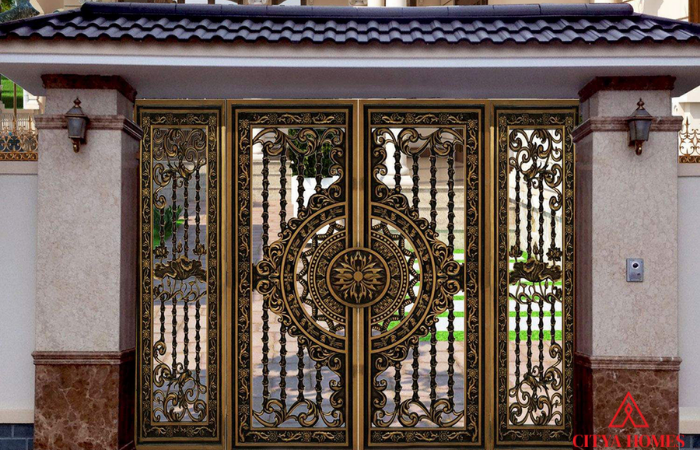 Mẫu cổng nhà vườn nông thôn bằng nhôn đúc sang trọng, tinh tế.