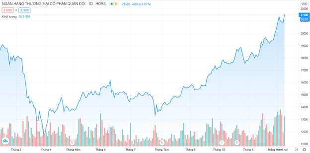 Trên sàn HOSE, MBB là một trong những cổ phiếu ngân hàng có đà tăng trưởng mạnh nhất. Từ mức đáy 11.800 đồng/cổ phiếu hồi cuối tháng 3, giá cổ phiếu MBB đã tăng 78%, lên 21.500 đồng/cổ phiếu (8/12). Chỉ trong riêng ngày 8/12, giá cổ phiếu tăng 2,87%.