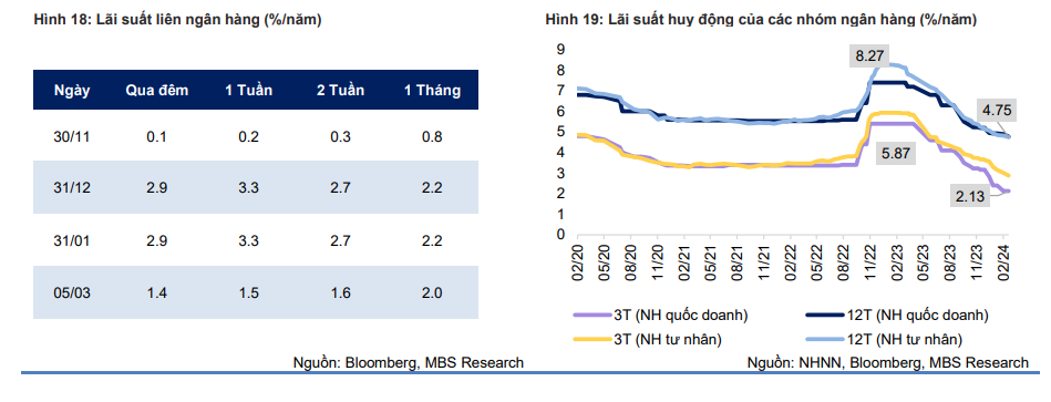 MBS cũng dự báo lãi suất huy động kỳ hạn 12 tháng của các NHTM lớn sẽ có thể nhích thêm 25 – 50 điểm cơ bản, quay về mức 5,25% - 5,5% trong năm 2024.