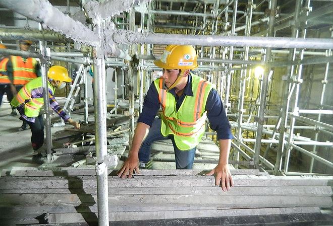 Công nhân đang thi công Ga Nhà hát thành phố. Ðể dự án tuyến metro số 1 hoàn thành đúng tiến độ, các nhà thầu ra quân từ mùng 8 Tết ảnh: Huy Thịnh