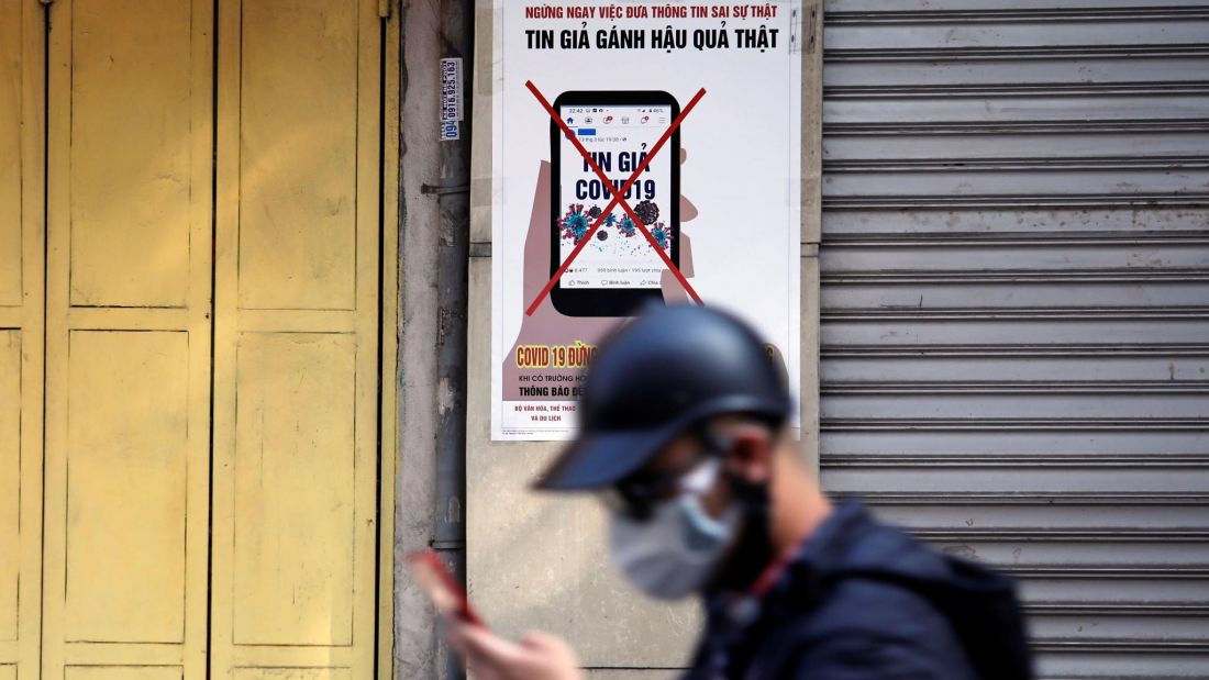 Một người đàn ông sử dụng điện thoại thông minh ở Hà Nội khi đi ngang qua một tấm áp phích cảnh báo chống lại việc phát tán "tin tức giả" về dịch Covid-19.