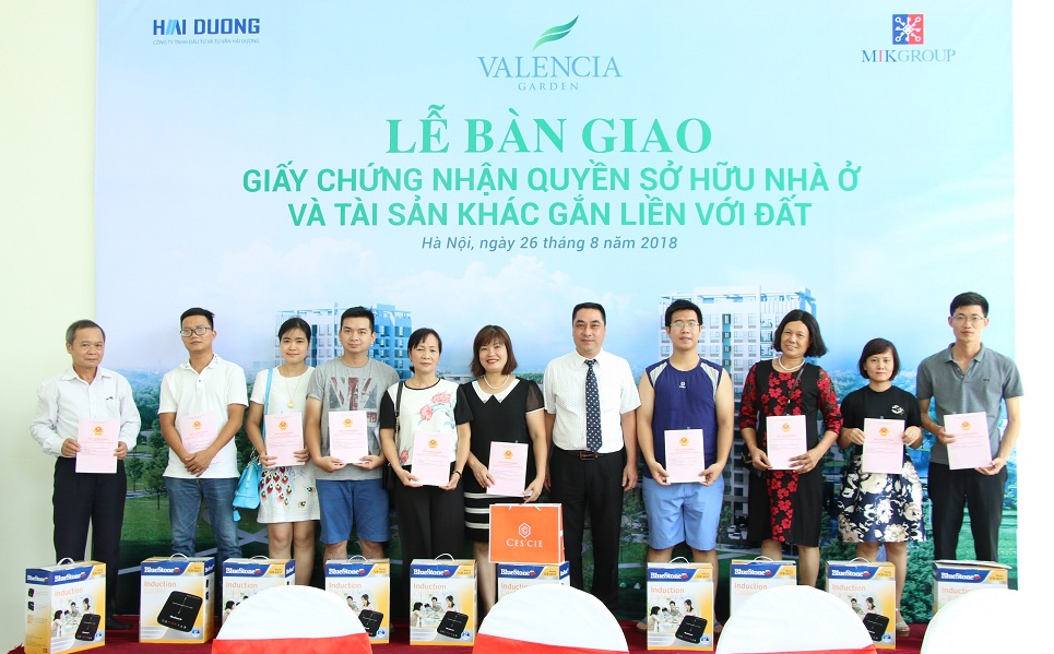 CafeLand - Sáng ngày 26/08 vừa qua, cư dân tại dự án Valencia Garden (CT19B Khu đô thị mới Việt Hưng, Long Biên, Hà Nội) đã được đơn vị phát triển dự án MIKGroup cùng chủ đầu tư Công ty TNHH đầu tư và tư vấn Hải Dương trao Giấy chứng nhận quyền sở hữu nhà ở.