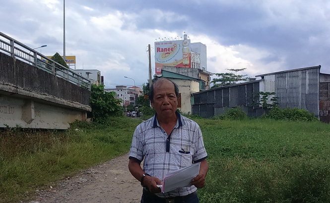 | Ông Phạm Thành Bé cầm bộ hồ sơ khiếu nại bên phần đất bị giải tỏa để làm cầu Nguyễn Trung Trực trước đây - Ảnh: Đ.Vịnh |