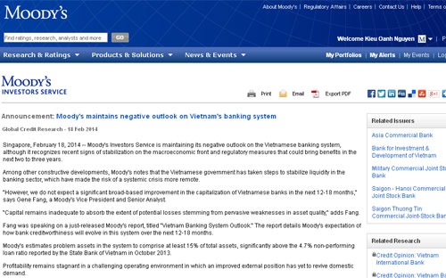 Báo cáo đề ngày 18/2 của Moody’s tỏ ra khá lạc quan khi nhận định rằng, những tín hiệu bình ổn gần đây về kinh tế vĩ mô cũng như những điều chỉnh trong quy chế giám sát sẽ đem lại lợi ích cho hệ thống ngân hàng của Việt Nam trong vòng 2-3 năm tới. Trong số những diễn biến tích cực được nhắc đến, Moody’s nhấn mạnh việc Chính phủ Việt Nam đã có những bước đi để bình ổn tình hình thanh khoản trong hệ thống ngân hàng, từ đó đẩy lùi nguy cơ xảy ra một cuộc khủng hoảng hệ thống.