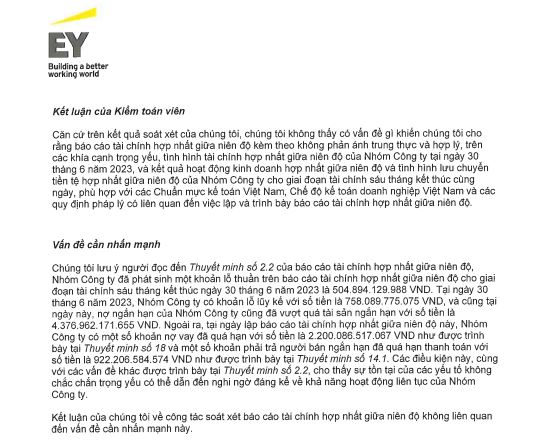 Tại BCTC soát xét bán niên 2023, đơn vị kiểm toán của Pomina là Ernst & Young Việt Nam đã có ý kiến nhấn mạnh liên quan tới khoản lỗ thuần gần 505 tỷ đồng và khoản lỗ luỹ kế 758 tỷ đồng tại thời điểm 30/6. Ngoài ra, nợ ngắn hạn vượt tài sản ngắn hạn với số tiền hơn 4.300 tỷ đồng.