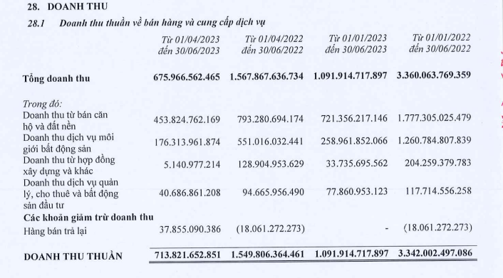 Ngoài ra, doanh thu từ dịch vụ môi giới cũng giảm mạnh từ 1.260 tỷ đồng cùng kỳ năm trước xuống còn 259 tỷ. Doanh thu từ hợp đồng xây dựng và khác cũng giảm mạnh từ 204 tỷ trong 6 tháng đầu năm 2022 xuống còn 34 tỷ đồng.