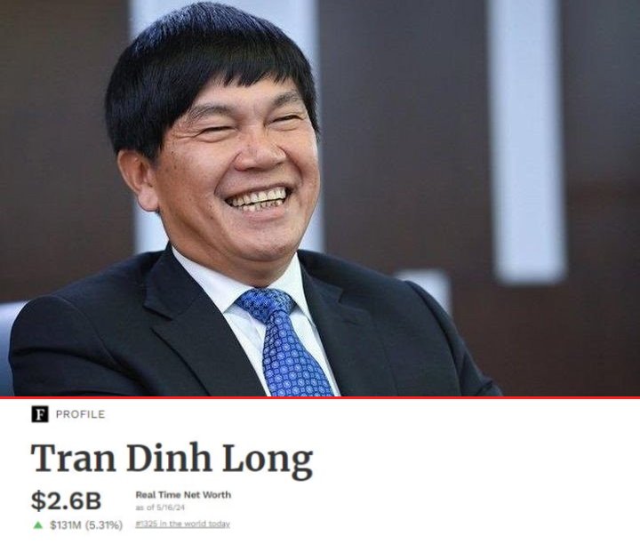 Theo thống kê của Forbes, tính đến ngày 16/5 (theo giờ Việt Nam), giá trị tài sản ròng của ông Trần Đình Long, Chủ tịch Tập đoàn Hòa Phát (Mã: HPG) là 2,6 tỷ USD, xếp thứ 1.323 thế giới và thứ 3 trong top 6 tỷ phú USD Việt Nam. Như vậy, sau gần 2 năm kể từ thời điểm tài sản mất mốc 1 tỷ USD, Chủ tịch Hòa Phát đã có thêm 1,6 tỷ USD.