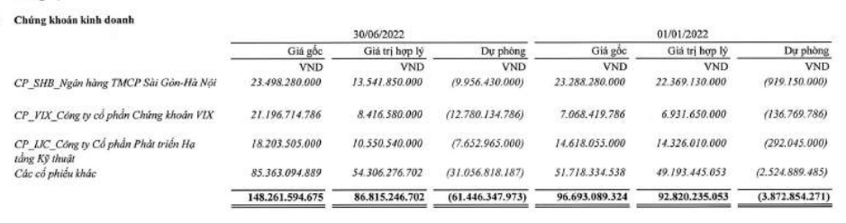 Đáng chú ý, Thép Tiến Lên tiếp tục rót thêm tiền đầu tư chứng khoán, giá trị chứng khoán kinh doanh thời điểm cuối quý 2 đạt 148,3 tỷ đồng, tăng 51,6 tỷ đồng so với đầu năm. Tuy nhiên, giá trị hợp lý tới thời điểm 30/6 chỉ còn lại gần 87 tỷ đồng, Thép Tiến Lên tạm lỗ lên đến hơn 61 tỷ đồng