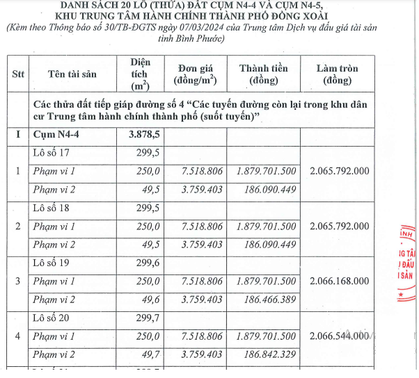 Từ ngày 07/03/2024 đến 17h00 ngày 29/03/2024, 20 thửa đất là tài sản của Trung tâm Phát triển quỹ đất thành phố Đồng Xoài sẽ được Trung tâm dịch vụ đấu giá tài sản tỉnh Bình Phước tổ chức đấu giá.