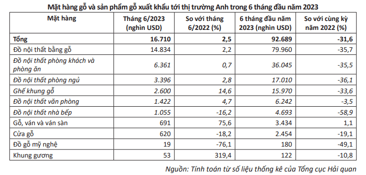 Bộ Công Thương cho biết, do lạm phát cao và người Anh thắt chặt chi tiêu khiến hoạt động xuất khẩu mặt hàng này tới Anh chịu tác động, trị giá xuất khẩu đồ nội thất bằng gỗ tới thị trường Anh đạt 80 triệu USD, giảm 36% so với cùng kỳ năm 2022.