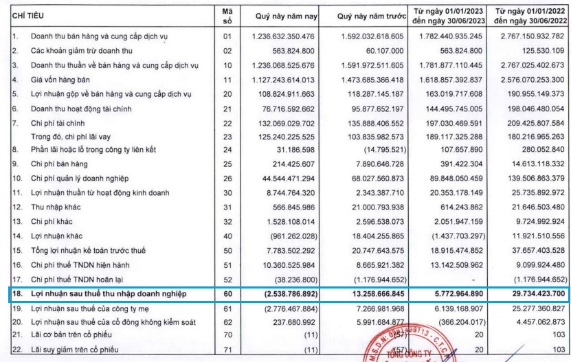 Công ty CP Đầu tư và Kinh doanh Nam An công bố tình hình tài chính bán niên 2023 với kết quả lỗ sau thuế hơn 255 tỷ đồng, trong khi cùng kỳ năm trước lãi hơn 679 tỷ đồng.