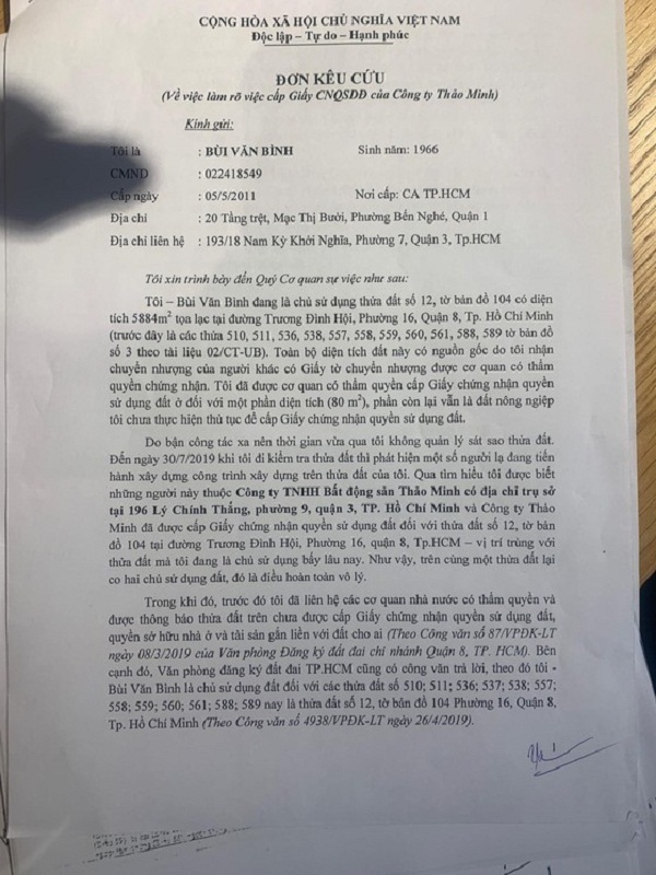 Theo đơn cầu cứu của ông Bình, ông là chủ sở hữu thửa đất số 12, tờ bản đồ 104 có diện tích 5.884m2 toạ lạc ở đường Trương Đình Hội, phường 16, quận 8, TPHCM (trước đây là các thửa 510, 511, 536, 538, 557, 558, 559, 560, 561, 588, 589 tờ bản đồ số 3 theo tài liệu 02/CT-UB). Toàn bộ diện tích đất này có nguồn gốc do ông nhận chuyển nhượng của người khác và có giấy tờ chuyển nhượng được các cơ quan chức năng chứng nhận.