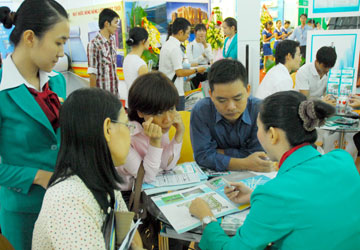 Việc mua bán nhà đất sẽ an toàn hơn khi được thanh toán qua ngân hàng. Trong ảnh: Giao dịch nhà đất tại hội chợ bất động sản. Ảnh: HTD