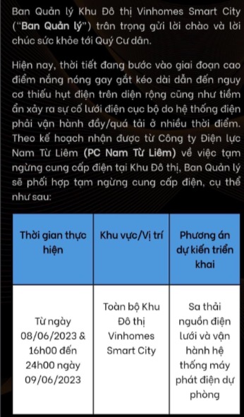 Thông báo của Ban quản lý khu đô thị Vinhomes Smartcity