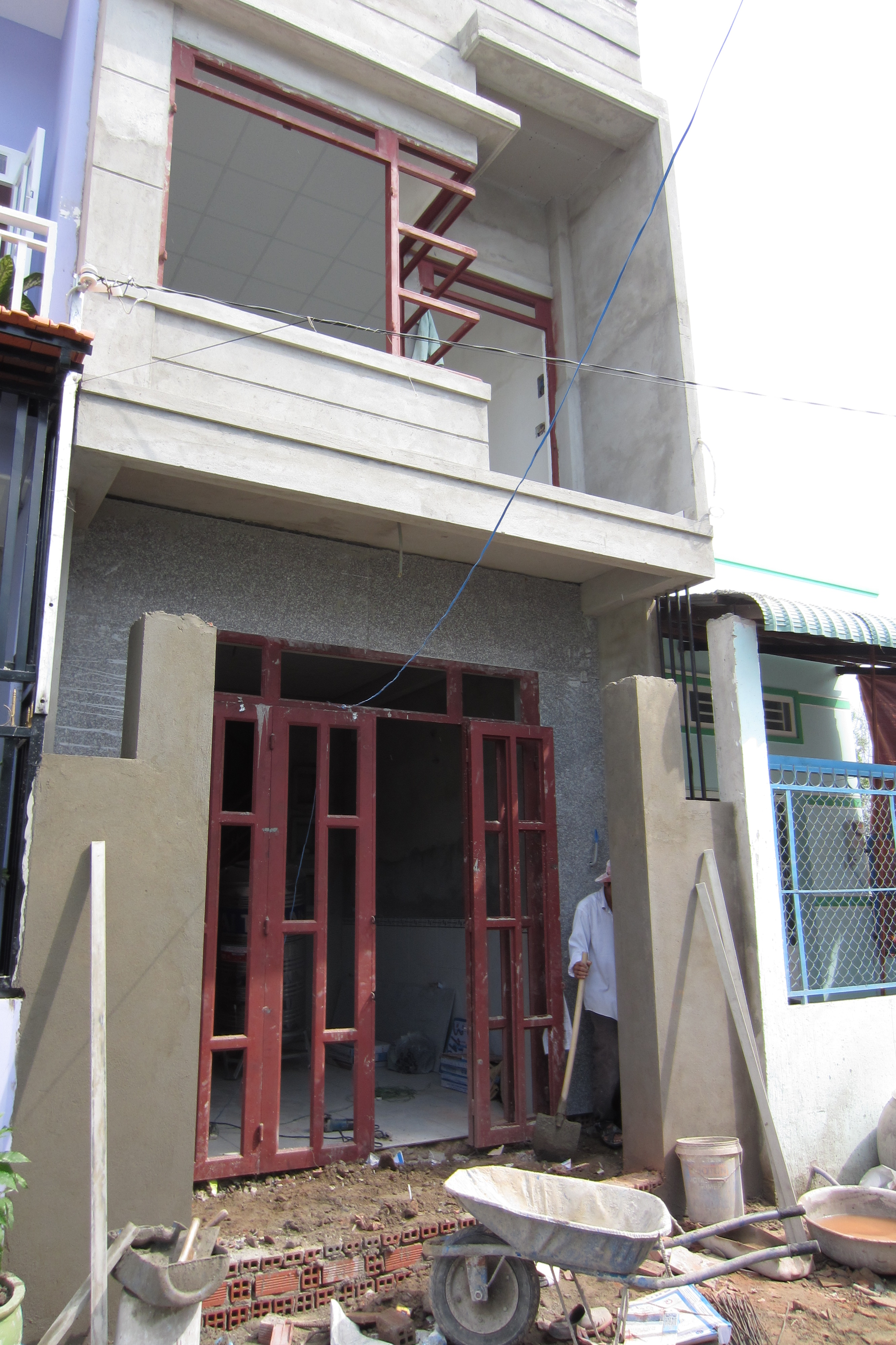 Vợ chồng anh Quốc là giáo viên cũng đang xây dựng một căn nhà gần đó có bề ngang 3,7m x 13m đang trong quá trình hoàn thiện. “Hai vợ chồng tui là dân giáo viên, dạy ở Bình Thạnh. Giờ muốn ra ngoại thành để ở cho nó có không khí thoải mái. Ở Bình Thạnh, căn nhà nhỏ quá, chật hẹp, ra đây, chỉ hơn 700 triệu đồng là có ngay một căn nhà một trệt, một lầu đúc nên hai vợ chồng cũng ky cóp mà xây nhà”, vợ anh Quốc cho biết.