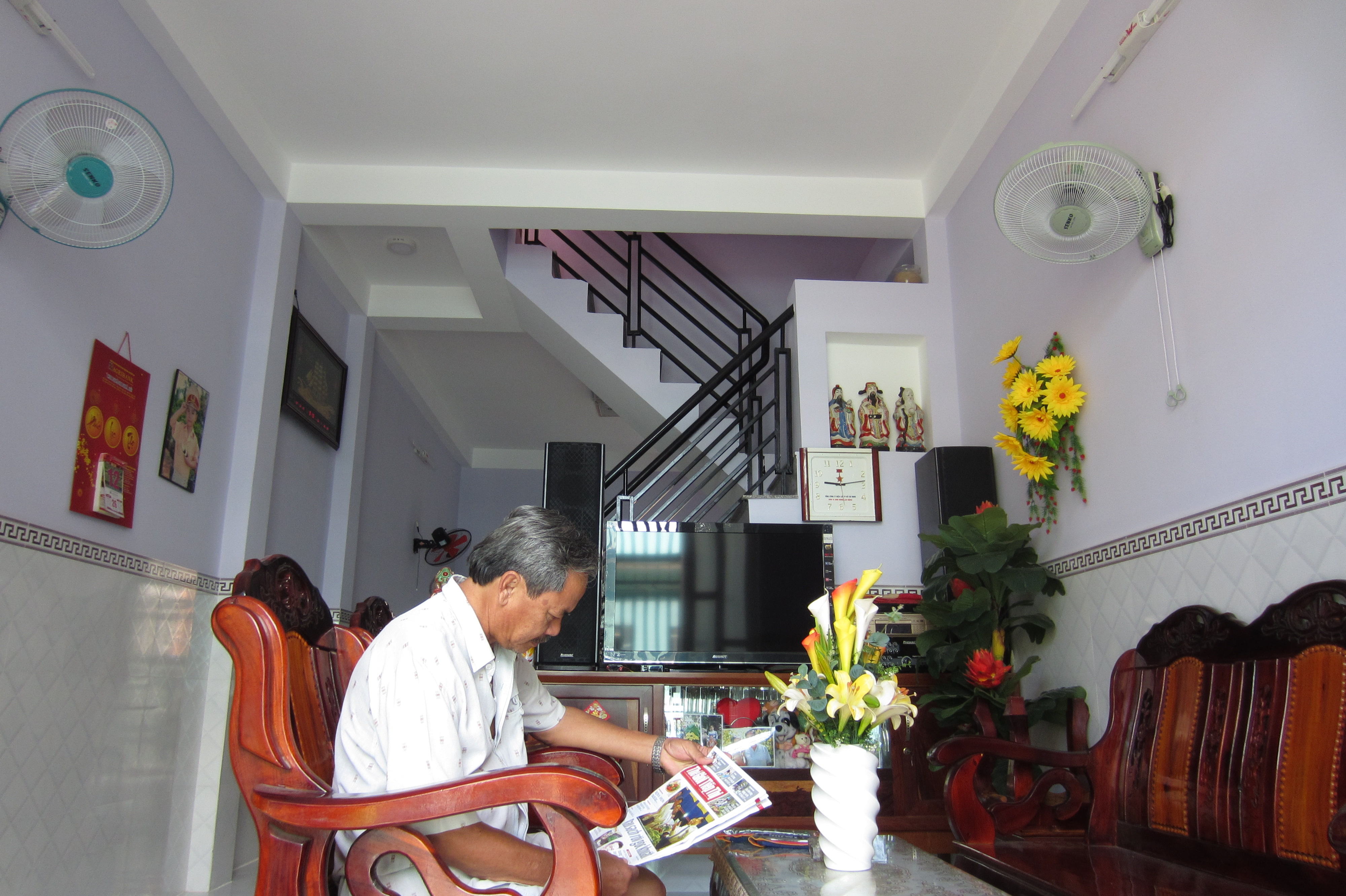 Căn nhà của ông Lê Công Ngà được sắp xếp có không gian phòng khách, ti vi, phòng bếp và 2 phòng ngủ trên tầng 1. “Giá nhà như ở đây là trung bình, không mắc cũng không rẻ, nếu lọt qua quận 7 thì không có cái giá đó đâu”, ông Ngà chia sẻ.