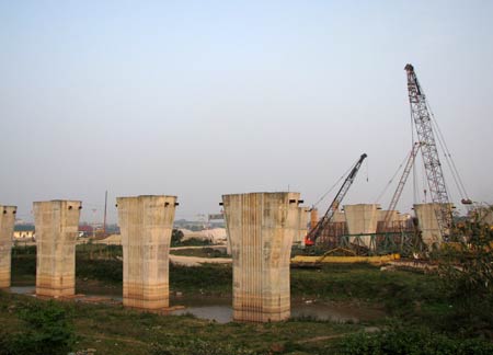 | Các cây cầu bắc qua sông Hồng, sông Đuống đang xây dựng, góp phần “hâm nóng” giá đất Đông Anh. |