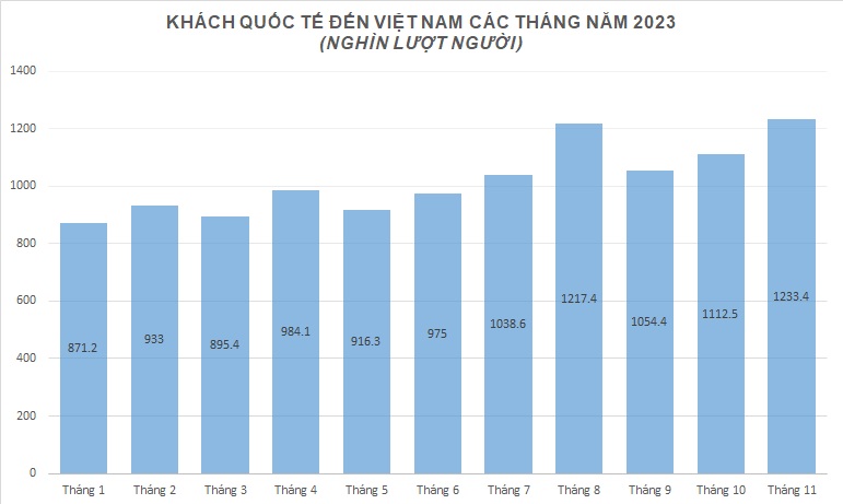 Theo thống kê, tháng 11/2023, khách quốc tế đến Việt Nam đạt hơn 1,2 triệu lượt khách, tăng gần 11% so với tháng trước và gấp hơn 2 lần cùng kỳ năm trước. Đây là tháng thứ 5 liên tiếp Việt Nam đón số lượng khách quốc tế vượt quá 1 triệu lượt người, cho thấy triển vọng tích cực của ngành du lịch trong tương lai gần.