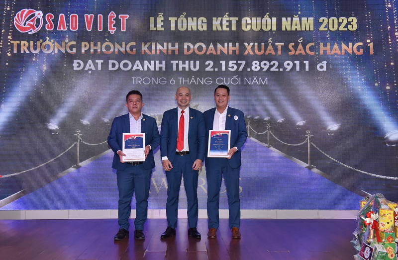 Cũng tại Lễ Tổng kết tình hình hoạt động kinh doanh năm 2023 diễn ra ngày 25/01/2024, Ban Lãnh đạo Sao Việt đã tuyên duơng và trao thưởng cho các danh hiệu tập thể Phòng kinh doanh xuất sắc cũng như vinh danh và khen thưởng các cá nhân đạt thành tích vượt bậc trong kinh doanh từ Nhân viên kinh doanh đến các vị trí quản lý như Trưởng Phòng xuất sắc, Giám đốc Sàn xuất sắc, Phó Tổng Giám đốc xuất sắc.