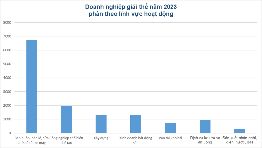 Lĩnh vực kinh doanh bất động sản ghi nhận số lượng doanh nghiệp ngừng hoạt động, giải thể tăng mạnh so với năm trước với gần 1.300 doanh nghiệp, tăng khoảng 8% so với 2022. Bình quân mỗi tháng, 107 doanh nghiệp ngành này phá sản, trong khi số lập mới giảm 45%, hơn 4.700 doanh nghiệp.