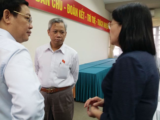 | Ông Trần Đình Long (giữa) trao đổi bên lề thảo luận tổ tại Quốc hội với Bộ trưởng Bộ Tài chính Vương Đình Huệ. Ảnh:NL |
