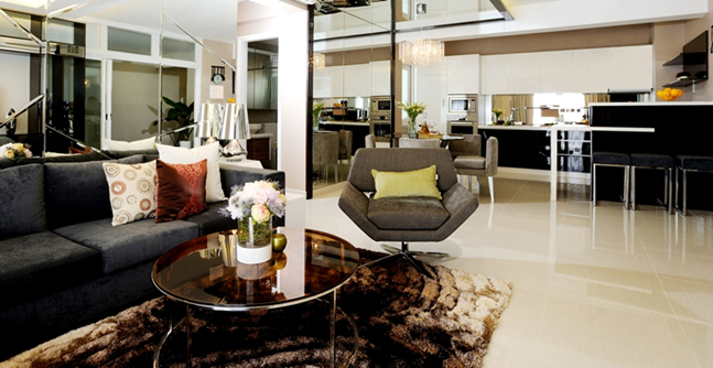 Phòng khách và phòng ăn, phòng bếp thông với nhau, nhưng qua chất liệu kính trang trí tường cùng với các điểm màu trung của sô pha, thảm… tạo nên một không gian sang trọng, rộng rãi và thoải mái.