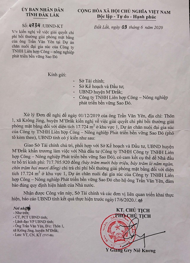 Trao đổi với Tiền Phong, ông Trần Văn Yên (SN 1970, trú tại xã Krông Jing) cho biết, năm 2009, UBND huyện Mđrắk ra quyết định thu hồi đất của gia đình ông và của hàng chục hộ dân khác để bàn giao mặt bằng cho Cty TNHH liên hợp công-nông nghiệp bền vững Sao Đỏ (Cty Sao Đỏ) làm dự án nuôi bò tại xã Ea Lai. Cụ thể, gia đình ông Yên bị thu hồi 1,7 ha đất (ở khu vực I) nằm ngay tại trung tâm dự án, với số tiền đền bù được phê duyệt hơn 700 triệu đồng.