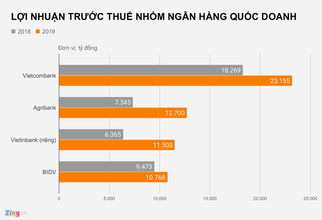 Hiện tại, 4 ngân hàng quốc doanh lớn nhất hệ thống (Agribank, Vietinbank, Vietcombank, BIDV) đều đã công bố kết quả lợi nhuận năm 2019. Trong đó, cả 4 nhà băng này đều đạt lợi nhuận kỷ lục từ trước đến nay.