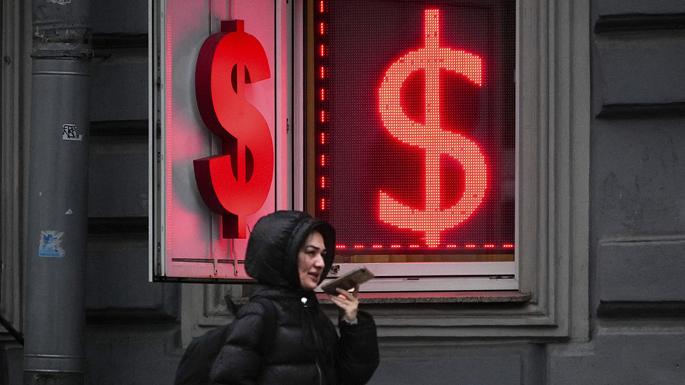 Một người phụ nữ đi ngang qua biển hiệu của một văn phòng đổi tiền ở St. Petersburg. Ảnh: AP/TASS
