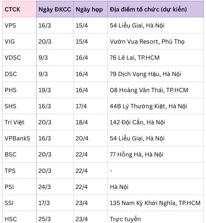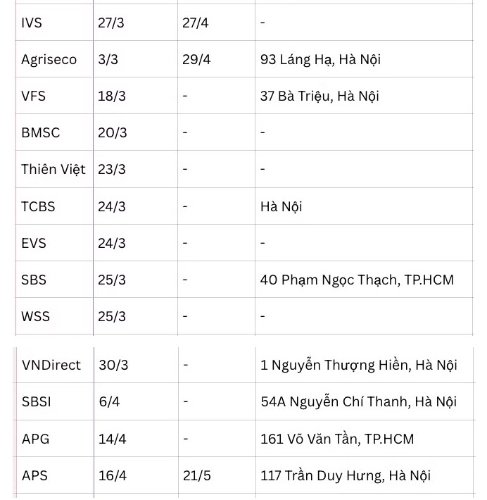 Ngoài các doanh nghiệp tập trung trong tháng 4, một số công ty dự kiến tổ chức muộn hơn. APS lên kế hoạch họp vào ngày 21/5 tại Hà Nội, trong khi VIX và TCSC đã thông báo gia hạn thời gian tổ chức sang tháng 6.