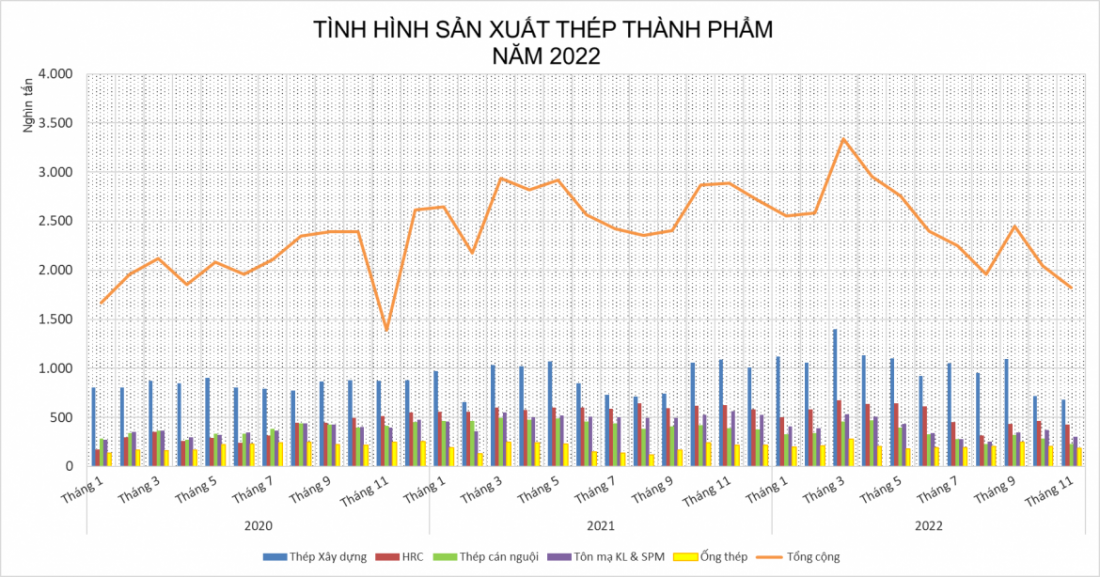 Sau 11 tháng đầu năm 2022, cả nước đã sản xuất được 27,12 triệu tấn thép các loại, tiêu thụ thép ở mức 25,12 triệu tấn, lần lượt giảm 11,3% và 6,8% so với cùng kỳ.