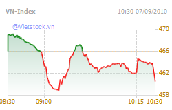 Kết thúc phiên, VN-Index giảm 5.41 điểm so với phiên trước, tương ứng với 1.16% đóng cửa tại 460.59 điểm. Thanh khoản sụt giảm còn 52.68 triệu đơn vị, trị giá hơn 1,350 tỷ đồng. Thị trường ghi nhận 152 mã giảm điểm, 72 mã tăng và 30 mã đứng giá. Trong số này có 34 mã tăng trần mà dẫn đầu là KSS và 11 mã giảm sàn.