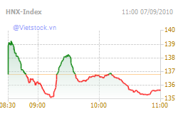 Từ giữa phiên, áp lực bán chiếm áp đảo khiến giá cổ phiếu và các chỉ số tiếp tục quay đầu đi xuống. VN-Index giảm 5.41 điểm và HNX-Index đánh rơi 135.65 điểm vào cuối phiên. Sự điều chỉnh giảm của hầu hết blue-chips trên cả hai sàn là nguyên nhân khiến thị trường không thể đứng vững mặc dù lực cầu vẫn còn rất mạnh.