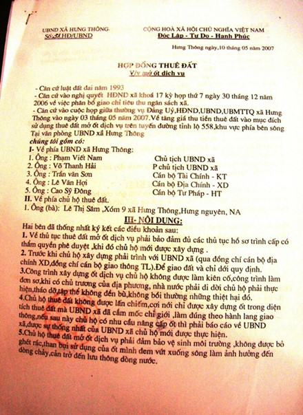 Một trong số hợp đồng do UBND xã Hưng Thông kí với các hộ dân
