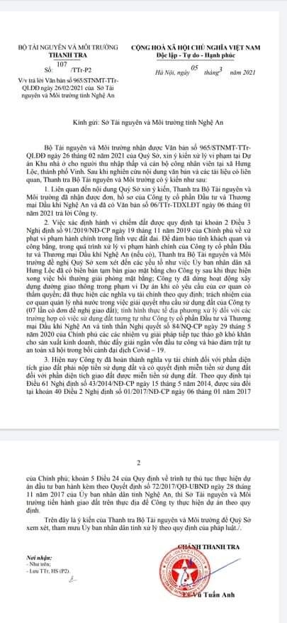 Trên cơ sở chỉ đạo giải quyết đơn của công dân, các cơ quan chức năng tỉnh Nghệ An đã nhiều lần kiểm tra hoạt động của doanh nghiệp và trao đổi ý kiến. Sau đó, các Sở cũng như UBND TP Vinh đã thống nhất Chủ đầu tư không vi phạm hành chính. Dù vậy, lãnh đạo UBND tỉnh Nghệ An đang thận trọng xem xét sự việc và chỉ đạo Sở Tài nguyên và Môi trường tiếp tục xin ý kiến của Bộ Tài nguyên và Môi trường.