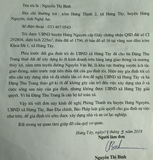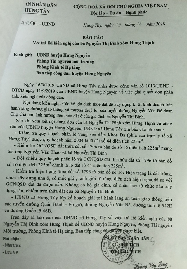 Mới đây nhất, sau khi nhận được đơn thư của gia đình bà Nguyễn Thị Binh, UBND huyện Hưng Nguyên có văn bản yêu cầu Chủ tịch UBND xã Hưng Tây kiểm tra, xử lý, giải quyết và trả lời công dân. Ngày 9/12/2019 UBND xã Hưng Tây có báo cáo số 492/BC-UBND trả lời kiến nghị của bà Nguyễn Thị Bình.