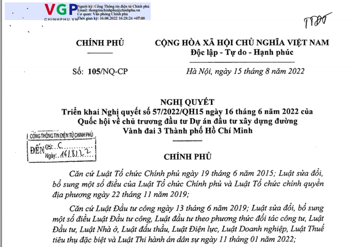 Dự án đầu tư xây dựng đường Vành đai 3 Thành phố Hồ Chí Minh (Dự án) đã được Quốc hội quyết định chủ trương đầu tư tại Nghị quyết số 57/2022/QH15 ngày 16/6/2022, chia thành 8 dự án thành phần thực hiện theo hình thức đầu tư công, đi qua địa bàn 03 tỉnh (Đồng Nai, Bình Dương, Long An) và Thành phố Hồ Chí Minh, trong đó có 04 dự án thành phần bồi thường hỗ trợ tái định cư. Mỗi dự án là một dự án thu hồi đất trên địa bàn của 01 tỉnh mà không phải là dự án thu hồi đất liên quan đến nhiều tỉnh, thành phố trực thuộc trung ương quy định tại khoản 1 Điều 87 Luật Đất đai năm 2013.