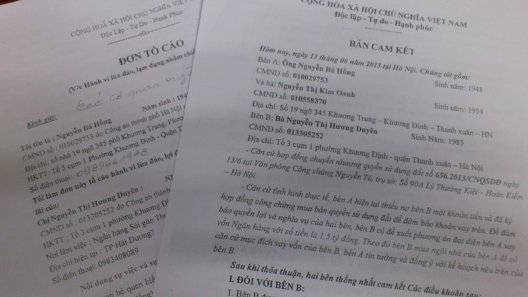 Do làm ăn thua lỗ cộng với việc hối thúc trả nợ của bà Duyên, gia đình ông Hồng đồng ý đưa toàn bộ giấy tờ nhà (có địa chỉ tại phố Khương Trung, phường Khương Đình, quận Thanh Xuân, Hà Nội)) cho bà Duyên làm thủ tục vay vốn ngân hàng với cam kết (bằng bản viết tay ký nhận các bên - PV) vay 1,5 tỷ đồng và không được tự ý sang tên sở hữu căn nhà này.