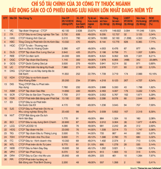 CafeLand - Thống kê cho thấy, hiện có khoảng 60 doanh nghiệp được xếp vào ngành bất động sản. Trong năm vừa qua, ngoài một vài cổ phiếu có mức tăng trưởng khá tốt như VIC của Vingroup, KDH của Khang Điền, DRH của Ngôi nhà mơ nước thì hầu hết cổ phiếu đều gặp khó khăn. Trong 30 doanh nghiệp được xem là lớn nhất trong ngành bất động sản hiện nay có đến 17 doanh nghiệp có giá cổ phiếu dưới mệnh giá. Cá biệt một số cổ phiếu đặc biệt khó khăn và giá cổ phiếu rất thấp như Quốc Cường Gia Lai, Đức Long