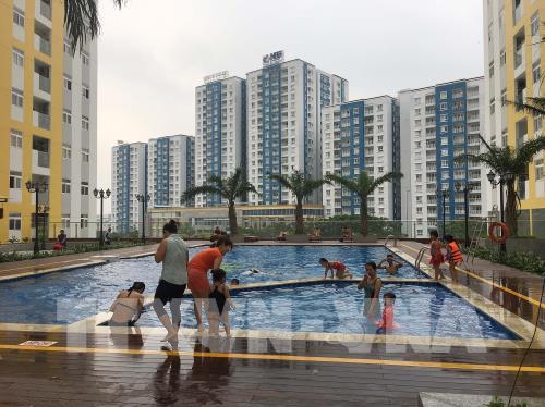 Nhiều hộ gia đình bị ảnh hưởng trong vụ cháy chung cư Carina Plaza yên tâm với cuộc sống mới tại nơi tạm cư chung cư City Gate Towers (đối diện chung cư Carina Plaza). Ảnh: Thanh Vũ - TTXVN
