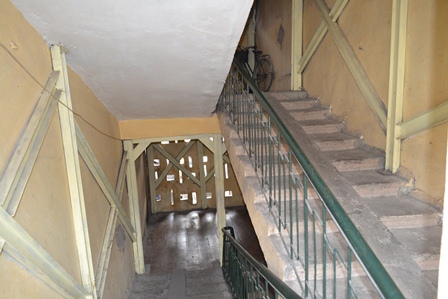 Cầu thang nhà A7 đang được gia cố tạm bợ bằng giàn giáo