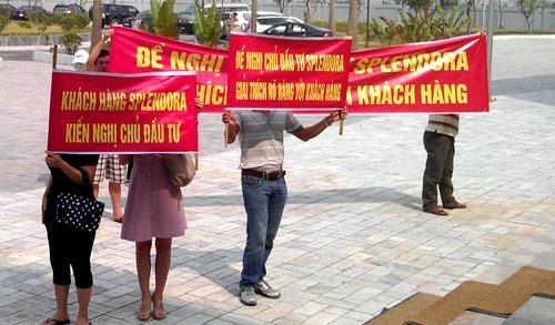 | Treo băng rôn, biểu tình là cách người mua nhà thường làm để đối phó với chủ đầu tư chậm triển khai dự án (ảnh Dân trí) |