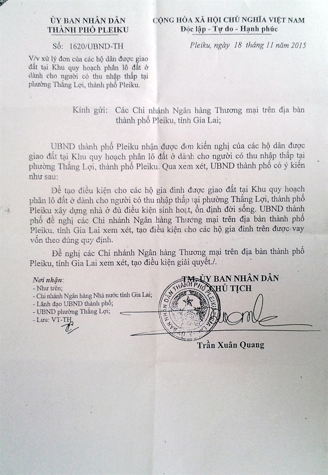 Vào ngày 18/11/2015, ông Trần Xuân Quang, Chủ tịch UBND TP. Pleiku ra văn bản số 1620/UBND-TH đề nghị các ngân hàng thương mại xem xét, tạo điều kiện cho các hộ gia đình trên được vay vốn.