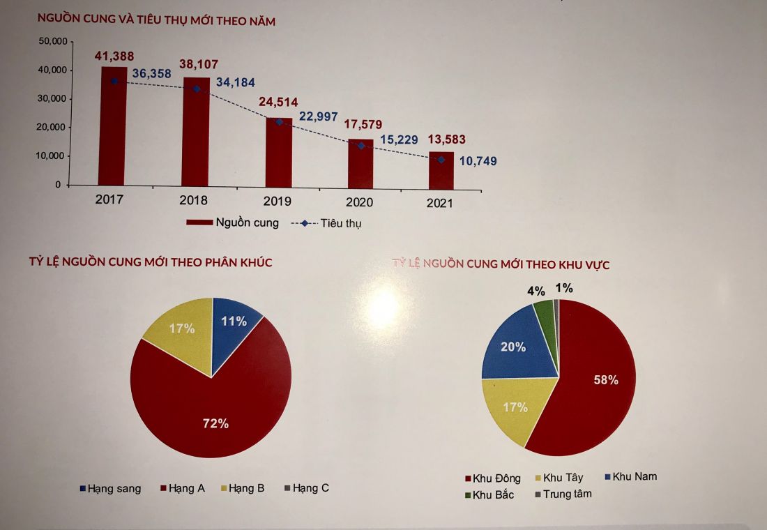 Thị trường căn hộ ghi nhận 41 dự án mở bán (khoảng 21.138 căn) trong năm qua. Các dự án tập trung chủ yếu tại TP.HCM và Bình Dương. So với năm 2020, tổng nguồn cung mới bằng 70% (30.042 căn). Lượng tiêu thụ đạt khoảng 17.122 căn, bằng 81% nguồn cung mới và chỉ bằng 65% so với năm trước (26.313 căn). Riêng tại TP.HCM, nguồn cung và lượng tiêu thụ giảm mạnh so với năm 2020 trở về trước, đây là mức thấp nhất kể từ năm 2015 đến nay. Loại hình căn hộ hạng sang tại TP.HCM đã xác lập mặt bằng giá mới lên đến gần 400 triệu đồng/m2.